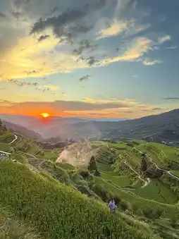 Come here to witness a breathtaking scene of mountains, terraced fields, and sunsets all in one frame.