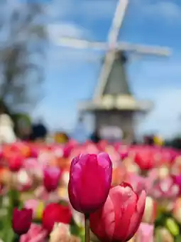 Winding paths meander through the sea of flowers, with windmills gently turning in the distance. A soft breeze carries the delicate scent of blossoms, slowing your pace as you immerse yourself in this romantic atmosphere. Each flower glimmers under the sunlight, as if whispering the secrets of spring.