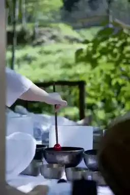 The sound of the instructor's singing bowl flows gently over your body like a forest stream.