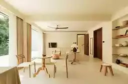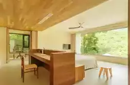 The homestay features a minimalist wabi-sabi style, with simplicity as its charm, extensively using natural wood, rammed earth, and bamboo weaving elements. Every room faces the valley, with floor-to-ceiling windows overlooking lush greenery. On sunny days, watch the sea of clouds roll by; on rainy days, listen to the rain hitting the bamboo forest. My favorite spot is the tea area in the courtyard, brewing local chrysanthemum tea with mountain spring water—this is true "slow living."