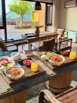 The B&B's own restaurant is so thoughtful! 🍜! Breakfast is a healthy spread, featuring porridge, side dishes, and whole grains, perfect for a refreshing start to the day. For dinner, you absolutely have to try the farmhouse cuisine 🥘. Fresh ingredients create authentic hometown flavors, and the roasted whole lamb is so delicious you'll drool! 🐑 In the evening, set up camping tables and chairs by the stream, take a bite of watermelon soaked in stream water, and chat in the evening breeze 💕—the feeling of bliss is simply overwhelming!