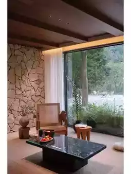 The second, third, and fourth floors are guest rooms, each with huge floor-to-ceiling windows overlooking stunning tree views. Sunlight streams through the large windows, blending the indoor and outdoor greenery into one.