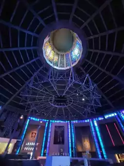 With its circular design and towering crown-like spire, the cathedral stands boldly against the city skyline, a symbol of innovation and inclusivity. Step inside, and you’re immediately wrapped in a kaleidoscope of colour and light. The stained glass lantern ceiling is the star of the show casting