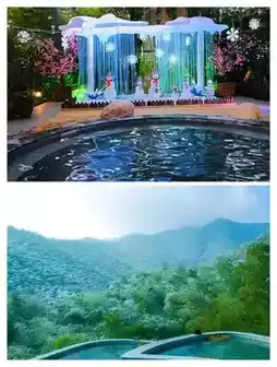 🛁Hot Springs Guide🕒Soaking Times:- Noon Soak: At noon, when you're physically and mentally tired, soaking in the hot springs under towering ancient trees and beside gurgling water, closing your eyes and listening to soothing music, can quickly restore your energy and refresh your mind.- Sunset Soak: As the sun sets, the afterglow sprinkles on the bamboo leaves, creating dappled light and shadows. As the temperature gradually drops, soak in the hot springs, sip on homemade fruit drinks, and experience different functional pools for a pleasant experience.- Night Soak: The hot springs are brilliantly lit at night, with colorful lights in the pools. The mountain breeze blows gently, and the bamboo shadows sway. Drive away all the fatigue of the day. After soaking, you can enjoy delicious food, watch performances, or relax and chat at the bar.🌿Pool Types:- Couples' Area: 12 private pools, such as the Drunken Beauty Pool and the Concentric Pool, hidden behind layers of forests or real mountains, are suitable for couples to enjoy their time together.- Dynamic Area: 13 pools where the spring water cascades down the mountain or gushes from the bottom of the pool, full of dynamic vitality.- Enrichment Area: 10 pools with added precious ingredients, such as ginseng and red wine, for health and relaxation.- Nature Area: 15 pools under thousand-year-old trees or in bamboo forests, integrated with nature.- Special Pools Area: There are two dry pools, mineral sand bath and sea salt bath. The mineral sand bath can eliminate fatigue and relax muscles and activate blood circulation; the sea salt bath leaves skin delicate and smooth.