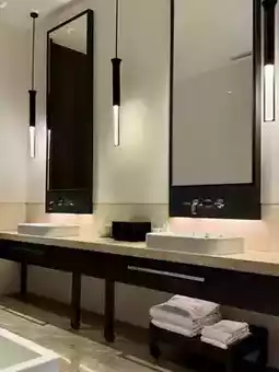 The tree-lined avenue leading to the hotel instantly isolates guests from outside noise, marking the beginning of the "secluded" experience. The entrance features a minimalist white wall and podocarpus trees as natural screens, while the lobby's floor-to-ceiling windows frame a landscape pool with glass boats that seamlessly connects to Tianmu Lake. The symmetrical layout of sofas and furnishings in the lobby lounge complements this breathtaking view. The outdoor infinity pool faces the lake, with bridges and pavilions extending over the water, serving both as docks and perfect panoramic viewing platforms. A stroll around the island reveals a courtyard where flowing water empties into a well, creating picturesque scenery.