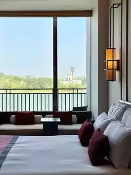 I stayed in a Lake View room featuring adjustable lighting modes and complimentary first-round minibar. The bathroom area boasts double vanities, a Dyson hairdryer, rain shower with premium amenities, and a smart toilet in a separated wet/dry area. The king bed offers pillow options (soft/firm) with decorative cushions, and the TV supports screen mirroring. Evening highlights included enjoying lake breezes on the balcony or soaking in the tub with endless lake vistas - both perfect ways to conclude the day.