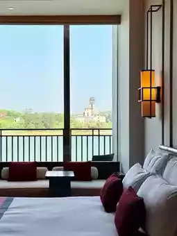 Drawing the curtains reveals a lakeside vista that instantly washes away travel fatigue.