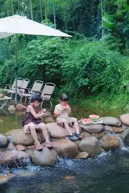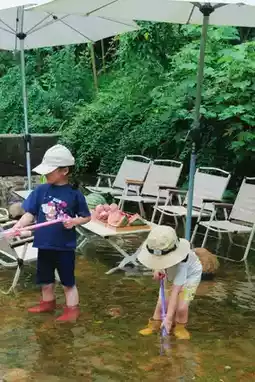 In summer, kids can enjoy not only the creek but also trampolines, swings, and climbing nets