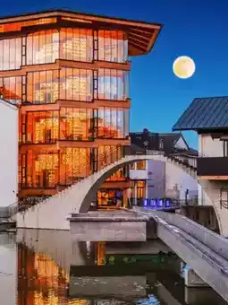 ✔Fangsuo Cultural Village: A collision of modern architecture and traditional Jiangnan aesthetics. When the lights come on at the blue hour, the white walls and black tiles glow warmly, like a flowing ink painting. The bookstore and café are perfect for artsy photos