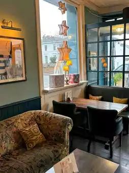 This is a good size pub that is set out in an ‘L’ shape and has a modern contemporary feel. The servery is clad in solid wood panels and is illuminated by classy pendants. The front area of the pub has an eclectic mix of comfy seating and a roaring fireplace, at rear is an area set aside for dining. The walls are painted bold colours and are adorned with a collection of pop art prints. Around the front of the pub are several benches and parasols for the warmer months.