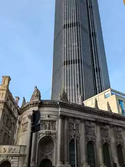 I started my stroll at Gibson Hall, the old National Provincial Bank at 13 Bishopsgate. Its Portland stone façade, Corinthian columns, and spotlit allegorical panels felt almost theatrical under the lamplight. I remembered that it was completed around 1865 as a lavish Victorian banking hall, now a beautifully preserved Grade I listed building.