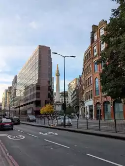 From there, I wandered down towards the Monument to the Great Fire of London, a towering Doric column standing exactly 202 feet from where the fire began on Pudding Lane. In the glow of dusk, it felt like a sentinel marking the passage of time.