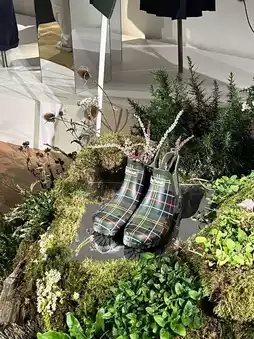 The exhibition features classic Barbour products, including clothing, shoes, and bags. It is also decorated with flowers and green plants to create a welcoming and vibrant atmosphere.