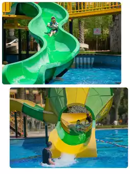 Rainbow slides + giant funnel rides for thrill-seekers! The family-friendly lazy river is perfect for kids (don’t forget swim caps).