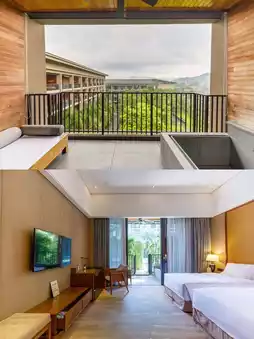 The resort opened in 2016, and as soon as we entered, we were greeted by lush greenery and fresh air~ Our family suite was adorable, featuring a private hot spring soaking tub—perfect for unwinding with the kids after a long day of play 🛀! The bed was extra spacious with soft sheets, and there was a tea set by the window. Sipping tea in the morning while admiring the mountain views was pure bliss.