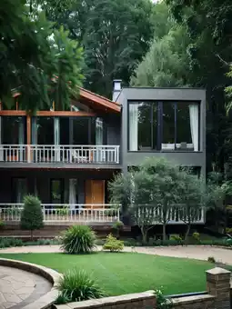 Wood-toned architecture surrounded by lush trees and emerald bamboo