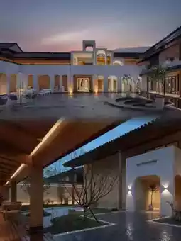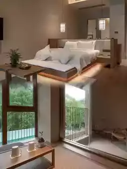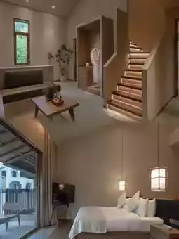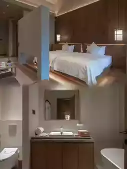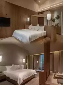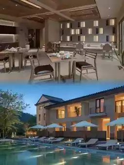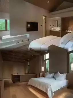 The guest rooms are mainly decorated in natural wood tones, with floor-to-ceiling windows framing the pool and bamboo forest like a natural painting. Equipped with smart toilets and Dyson hairdryers, the mattress has just the right firmness, and at night you can apply a face mask while stargazing. The reed lamps by the soaking pool create perfect supplementary lighting effects.