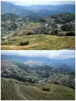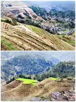 The terrain of Longji Terraces ranges from 800m to 1,500m above sea level, with a large vertical drop, forming a distinct three-dimensional climate. The high-altitude areas are surrounded by clouds and fog, with abundant rainfall, providing high-quality mountain spring water for rice growth. The terraced fields are mainly distributed below the hillside, because these areas have a long frost-free period and sufficient sunshine, which are suitable for crop growth. Overlooking from the top of the mountain, the outline of the terraced fields is looming in the mist, and the sound of gurgling water is endless, as if you are in a Chinese ink painting.