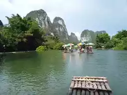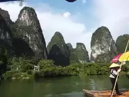 The Shui’e Di Pier is relatively accessible and offers a shorter experience, perfect for a quick bamboo rafting adventure. You can call a car from Yangshuo town to the ticket office, purchase tickets, and then queue at the entrance. Each bamboo raft accommodates only two people, with a combined weight limit (including belongings) of 160kg. If you exceed the limit, you’ll need to split into another raft. Before boarding, both passengers must weigh in together. Life jackets are provided and can be worn throughout the ride. The boatman will use an umbrella to shield you from the sun, but it’s advisable to bring a hat for extra protection. The Shui’e Di route is smooth and not too thrilling, but since bamboo rafts are permeable, expect slightly wet feet. Occasionally, there are downhill sections where you’ll need to lift your feet—don’t worry, the boatman will remind you.