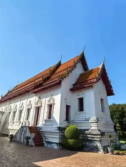 The Chanthara Phisan Throne Hall features traditional Thai architecture, resembling a chapel or temple. Its front includes a protruding porch where the king would appear to meet officials gathered in the courtyard. After the palace was abandoned, the structure fell into ruin, leaving only the walls. It was later restored during the reign of King Mongkut (Rama IV).