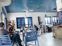 While walking around the Luang Prabang walking street, we stopped for lunch at Indigo Café. The shop is right on the corner. The atmosphere is great. Decorated in a Mediterranean style, clean white and blue, with green trees scattered around, giving a chill and relaxing feeling.