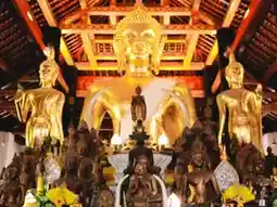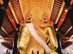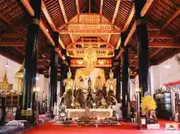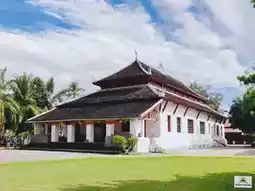 🙏The ordination hall is designed in the Lanna-Tai Lue Sipsongpanna architecture. The roof is multi-layered, decorated with a gable (hong) and a beautiful Khong gate arch. There is the largest principal Buddha image in Luang Prabang, along with wooden, bronze Buddha images and stone inscriptions collected from abandoned temples in the area.