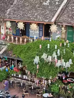 Maison Sam San is a rooftop café and bar in Luang Prabang, praised for its stunning views of the old town. It's an ideal spot for sipping tea or cocktails while enjoying the sunset. The ground floor features Lao artists' handcrafted products, while the top floor houses the Rooftop Tea House & Bar, offering high-quality organic teas and creative cocktails made with local ingredients. Conveniently located in the heart of Luang Prabang, this venue is perfect for relaxation and socializing.