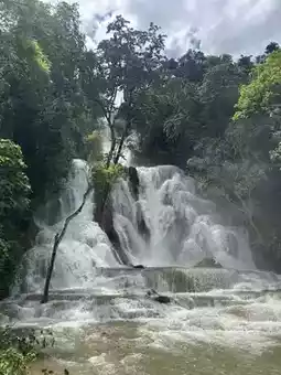 Just outside the town lies the Kuang Si Waterfall. Although the rainy season prevented us from seeing its usual stunning blue-green hues, the powerful waterfall was still awe-inspiring, and you can even take a swim there. 🏊