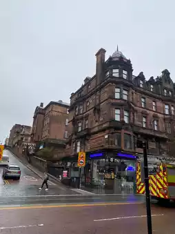 • Walking into the small town of Interlaken, the cobblestone streets gleam in the rain, and the warm yellow lights of the café windows contrast with the damp and cool outside.