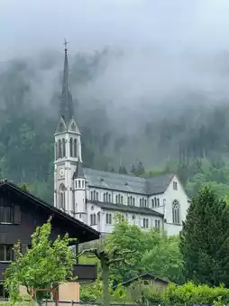 The Church of the Sacred Heart of Jesus in Lugern, Switzerland, is a gem of religious architecture nestled between Lake Lucerne and the Alps. With a blend of Gothic and Romanesque styles, its white stone facade and dark gray spire stand out against the blue sky. From the towering spire, the emerald waters of Lake Lucerne are a spectacular sight.