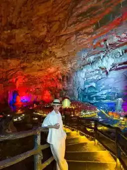 1️⃣ Take the small train to Changsheng Cave first. The scenery along the way is beautiful, overlooking the village 🏡. It takes about ten minutes to reach Changsheng Cave, which is cool inside and even brews a lot of rice wine. The cave has many naturally formed stalactites, and with the lighting, the view is stunning! (The last small train is at 16:30, please pay attention to the time)