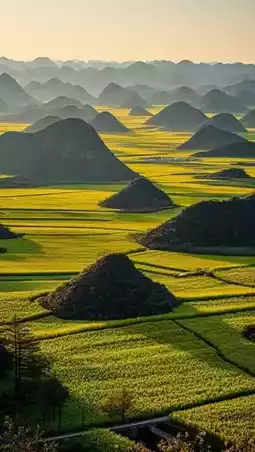 Morning: Go to Luoping Jinji Peak Cluster, climb to the top to overlook the vast rapeseed flower sea (golden rice fields in autumn), and feel the magnificent scene.
