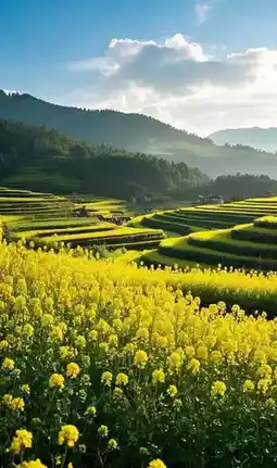 • Attractions: Jiangling Terraced Fields, Huangling Village. The golden rapeseed flower sea complements the Hui-style architecture, creating a breathtaking view.