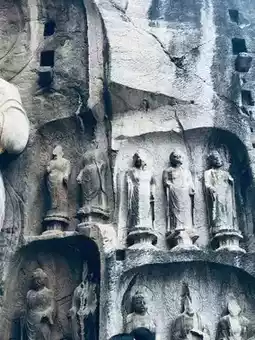 Entering the scenic area, the solemn figure of the Vairocana Buddha first fills the view. This main Buddha, standing 17.14 meters tall, is a masterpiece from the Wu Zetian period. His face is full and plump, eyebrows like crescent moons, eyes slightly lowered, and the corners of his mouth hold a gentle, faint smile, as if he can perceive all things in the world. When sunlight slants across, the folds of his robe ripple like waves, and the fine carving details are clearly visible. His expression, combining majesty and compassion, allows every visitor to feel a spiritual shock that transcends time and space. Legend has it that the Buddha’s face was sculpted based on Wu Zetian’s appearance, cleverly blending imperial and divine authority, becoming the most vivid epitome of the grandeur of the High Tang era.