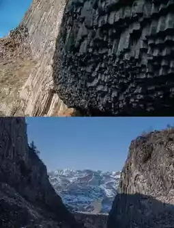 These are volcanic rock formations that collapsed into stacked, naturally suspended cubic structures—symmetrical hexagonal and pentagonal basalt columns nearly 50 meters tall. From afar, they resemble an accordion 🪗.
