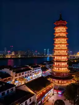 Highlights: A Tang Dynasty ancient tower, 50.86 meters tall, offering panoramic views of old Nanchang city from the top. The Shengjin Tower Food Street below is bustling. Elders can enjoy opera at the teahouse beside the tower (15 RMB/person), children can buy sugar paintings (10 RMB each). The tower is beautifully lit at night.