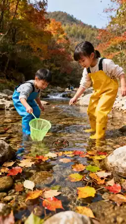 - Talc Creek Crab Hunting: In autumn, the creek water is clear, and small crabs hide in the cracks between stones on the shore. Carefully search with your kids to enjoy the fun of catching crabs by hand. Fallen leaves cover the creekside, making a rustling sound when stepped on, combined with the mist from the waterfall, creating a fairy-tale atmosphere.