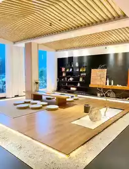 Not an over-the-top style, the pure white house is surrounded by green trees, looking especially fresh. The lobby’s light and shadow play immediately impresses you when you enter. Sunlight filters through wooden latticework, making it perfect for photos. There’s a pond in the yard reflecting the distant mountains, shimmering beautifully at dusk. There’s also a camellia forest, which must be even more poetic in autumn and winter.