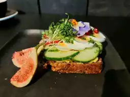 This is an open-faced toast sandwich similar to Scandinavian smørrebrød. The bread is rye bread topped with egg salad, cucumber, boiled egg, and pomegranate. Simple but beautifully decorated, very enjoyable to eat.