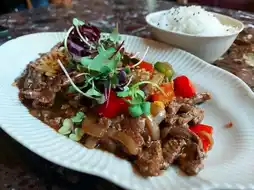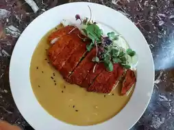 Fried breaded chicken served with jasmine rice and curry. It's clear that the dish is intended to be Japanese-style curry, but they use jasmine rice instead of Japanese rice. The curry doesn't taste like authentic Japanese curry, but it's slightly sweet and has a distinct lemongrass flavor. The fried chicken was excellent, with tender meat and a crispy batter that wasn't greasy. A small salad was served as a side dish. Overall, it was quite good.
