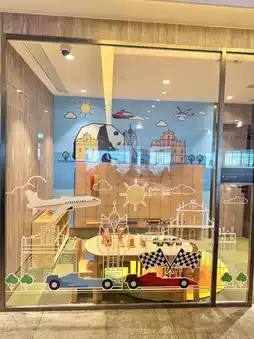 There are shower rooms, a playroom (a space like a kids' room), and a large lounge with many seats.