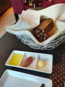 First, a complimentary bread basket is served, with three types of homemade specialty bread, accompanied by butter, olive oil, and a sauce made with Portuguese sausage.