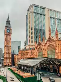 ➡️Walk for six or seven minutes to The Londoner Macao, inspired by London, with Big Ben, London buses, and telephone booths for photos.
