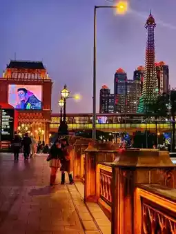 📍 The Cotai area is most famous for its renowned hotels, including the Cotai Strip, The Venetian Macao, Studio City Macau, The Parisian Macao, and more.