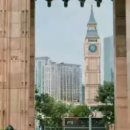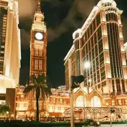 The unique perspective offers a panoramic view of Macau's modern architecture and the Big Ben-style architecture in the distance, with a sense of layering.