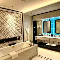 The guest room design is British style. The whole room is dominated by blue tones, with exquisite decoration, creating an elegant and light luxury feeling. The overall sense of space and lighting are full! The bed is of moderate size and firmness, the bathroom is mainly white, full of luxury, and equipped with a large bathtub, it is definitely a luxurious accommodation experience!