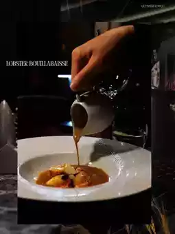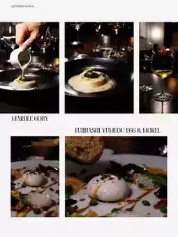 The menu includes five main courses (Hokkaido scallop, Lobster Bouillabaisse, Fujihashi Yumeou egg & Morel, Marble goby, Quail) and a dessert (Pistachio Tiramisù).