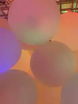 Giant Inflatable Balls: The space is filled with giant inflatable balls that visitors can push around with their bodies or heads. The ceiling is equipped with various colored spotlights, causing the entire venue to change colors constantly. Additionally, giant fans on the ceiling blow the balls around every minute, creating a fun and interactive environment for both adults and children 😄
