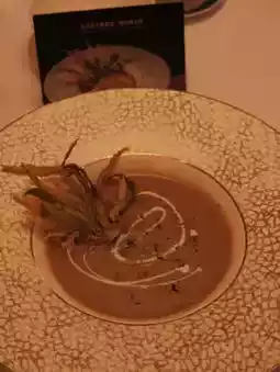 It is chestnut chicken soup with fried king flower, the soup is thick and smooth.