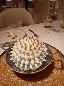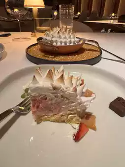 🍰 For dessert, we ordered the visually stunning Flame Snow Mountain: the outer layer of cream mousse filling was burned with edible alcohol and ignited, echoing the raspberry ice cream inside. The attractive presentation of fire and ice is very suitable for holiday celebrations🥳